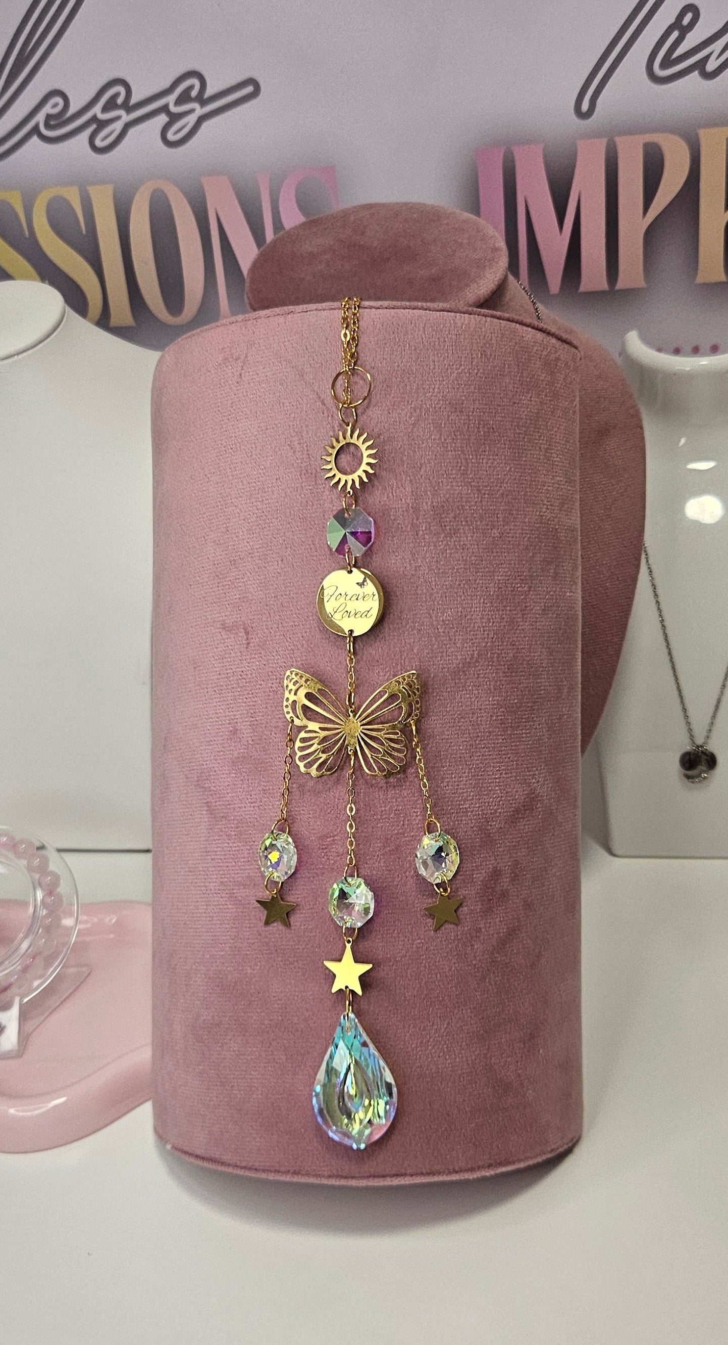 Stunning luxury butterfly sun catcher charm featuring a premium 18k gold plated stainless steel pendant. Can be personalised with images, text, handwriting, fingerprints ect.