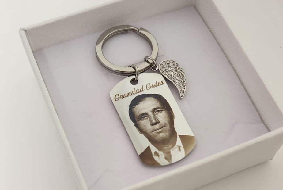 The stainless steel keyring with angel wing charm.It can be customized with engraving on both sides, accommodating handwriting, text, images, or fingerprint.